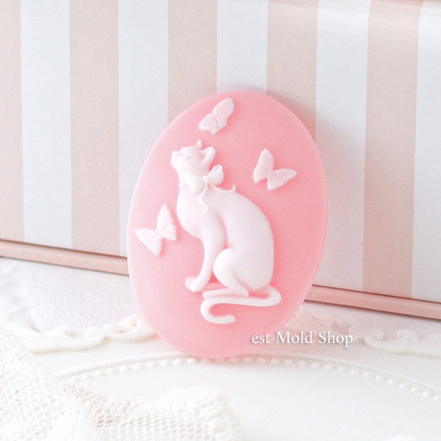 蝶と戯れるネコが愛らしいカメオのシリコンモールド
